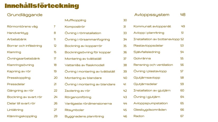 Rörmokarens handbok följer rörmontörsstuderandens väg genom teorin och stannar upp vid olika material, metoder och system. Verket ger 150 lärdomar om rörinstallation och grundläggande färdigheter för att arbeta som rörmokare. Boken är illustrerad med ritningar och är en tydlig guide för dem som studerar till rörmontör. I verket har författaren sammanfattat över 20 års erfarenhet som rörmokare, företagare och utbildare. Boken är spiralbunden i A6-format och följer med studenten i fickan på arbetskläderna.